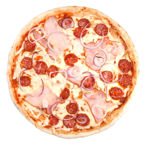Sos cu pulpa de rosii, topping pizza, ciuperci proaspete, sunca, bacon, porumb, masline
