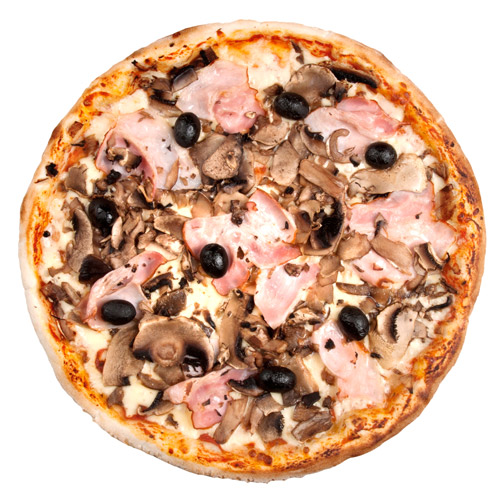 Sos cu pulpa de rosii, topping de pizza, ciuperci proaspete, sunca, bacon, ceapa, usturoi, peperoncino