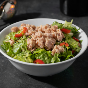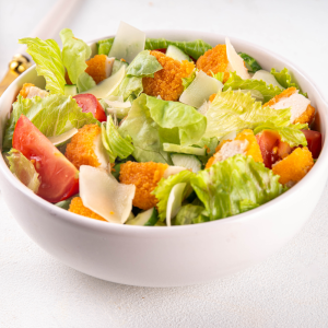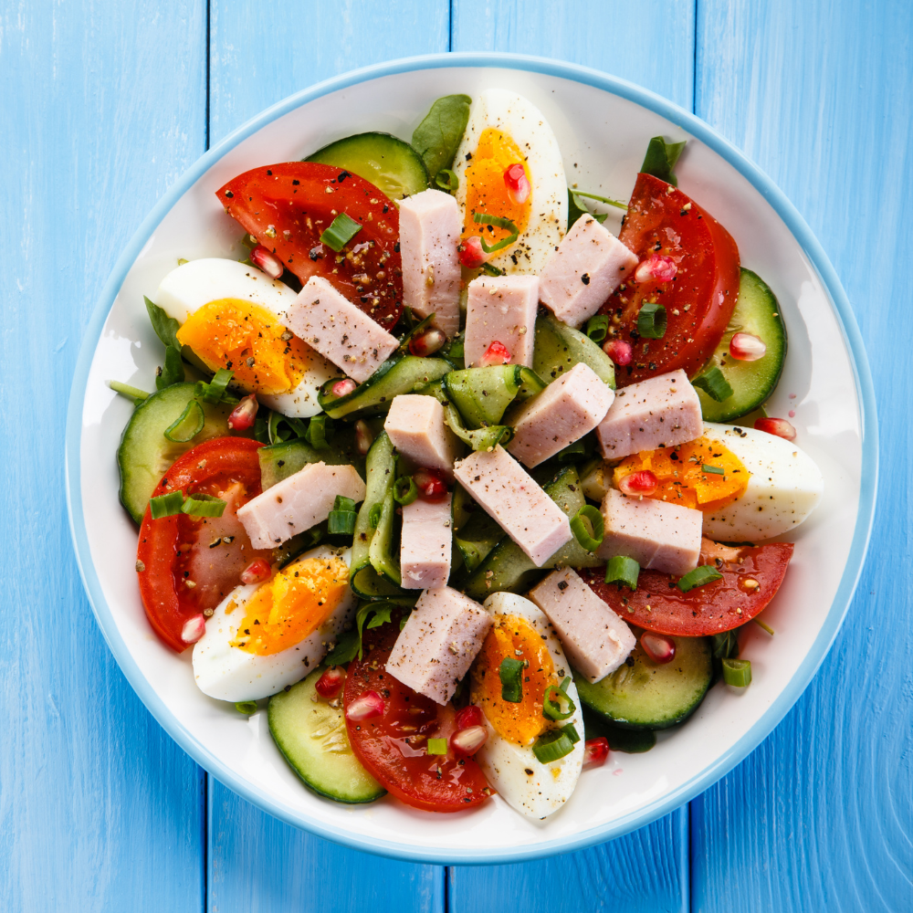 Cu salata verde, castraveti, rosii, ardei gras, sunca, branza, masline, ou.